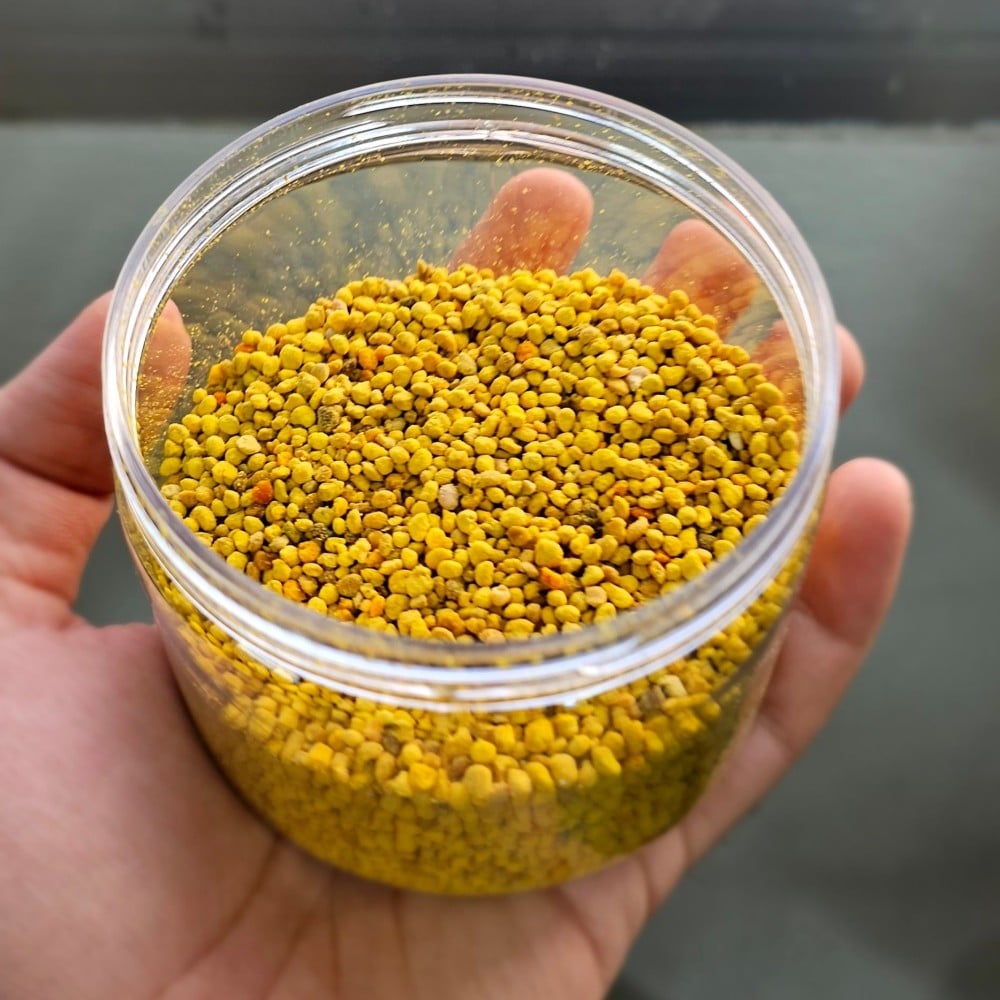 ج: هي بودرة ناعمة موجودة في الأزهار، وهي ما تسمى بلقاح الأزهار، وهذه البودرة تعلق في أماكن مختلفة من جسم النحلة عندما تقترب من هذه الأزهار، وتقوم النحلة بتخزين هذه البودرة في أماكن خاصة في قدميها الخلفيتين، ثمّ تنقلها إلى أماكن خاصّة في الخليّة تسمّى بالمصائد.